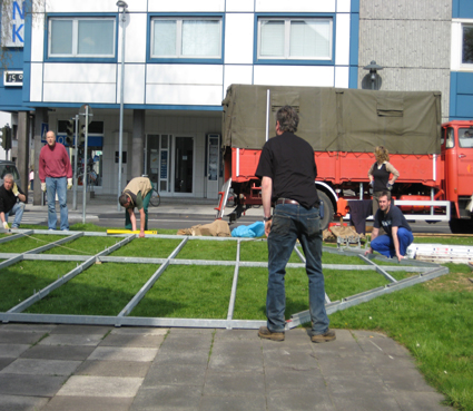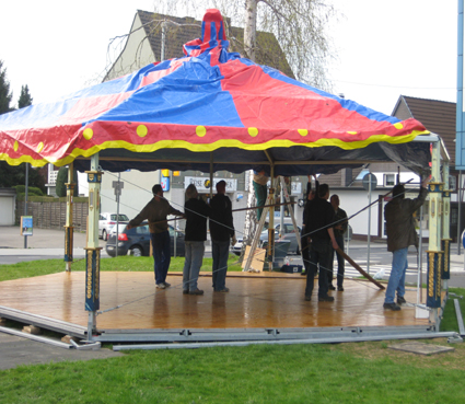 Zeltaufbau mit vielen Helfern