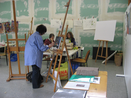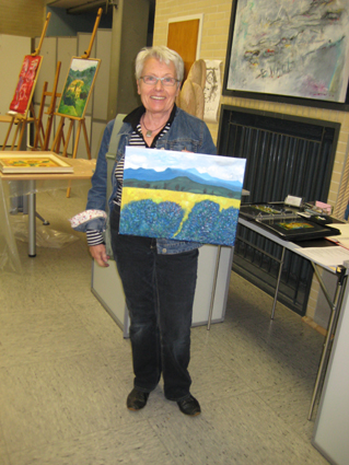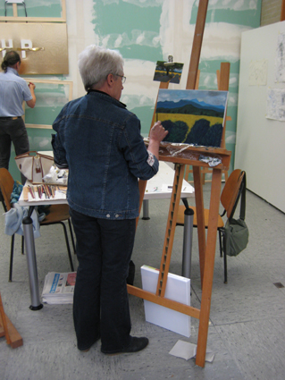 Diese Besucherin malt zum 1. Mal mit Ölfarbe. Elke Bock zeigt ihr die Arbeitsweise.