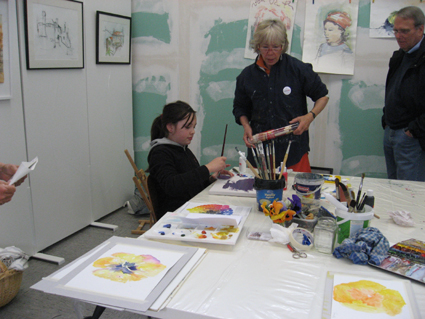 Eine junge Besucherin übt sich in der Acrylmalerei unter Anleitung von Dorothea Deparade-Bessel