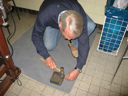 Ein Besucher muss in die Knie gehen, um sein Werkstück zu hämmern.