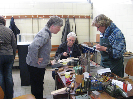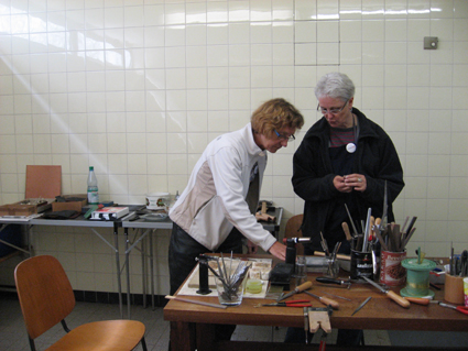 Unsere Bildhauerin Petra Wagner vertauscht ihre großen Feilen und Meissel für eine Zeit mit den feinen Werkzeugen der Goldschmiede, um sich einen Ring zu fertigen. Martina Furk leitet sie an.