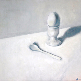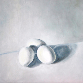 Eier auf weißem Tischtuch : Straußenei Gänseeier Hühnerei Öl auf Leinwand je 40 x 40 cm 2008